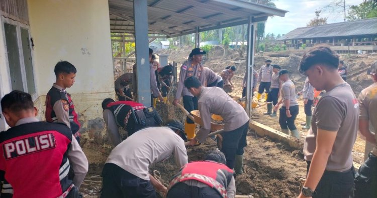 Dengan penuh semangat, personel Polri bersama warga bahu-membahu membersihkan lumpur yang mengendap di dalam ruangan pelayanan, kamar pemeriksaan, garasi, hingga area lingkungan sekitar Polindes.